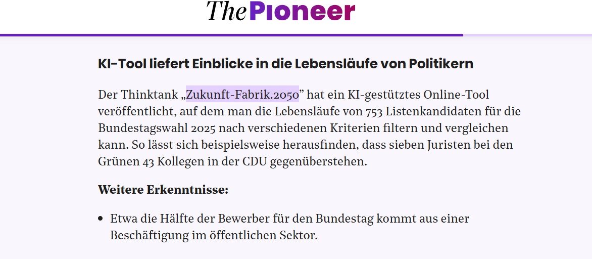 „Der Thinktank „Zukunft-Fabrik.2050” hat ein KI-gestütztes Online-Tool veröffentlicht, auf dem man die Lebensläufe von 753 Listenkandidaten für die Bundestagswahl 2025 nach verschiedenen Kriterien filtern und vergleichen kann. So lässt sich beispielsweise herausfinden, dass sieben Juristen bei den Grünen 43 Kollegen in der CDU gegenüberstehen.“